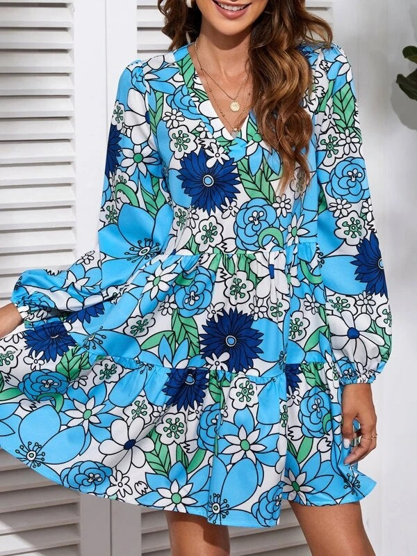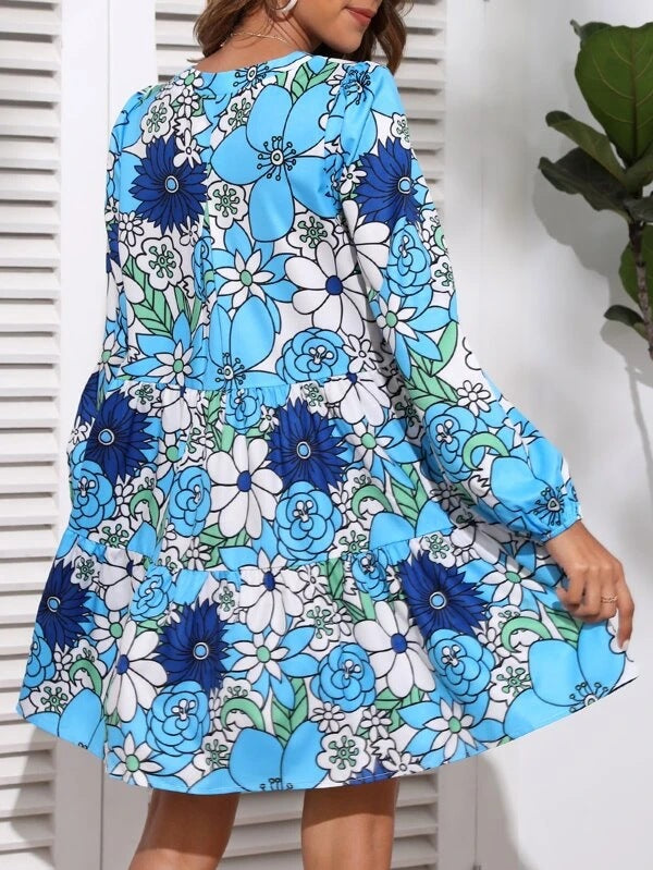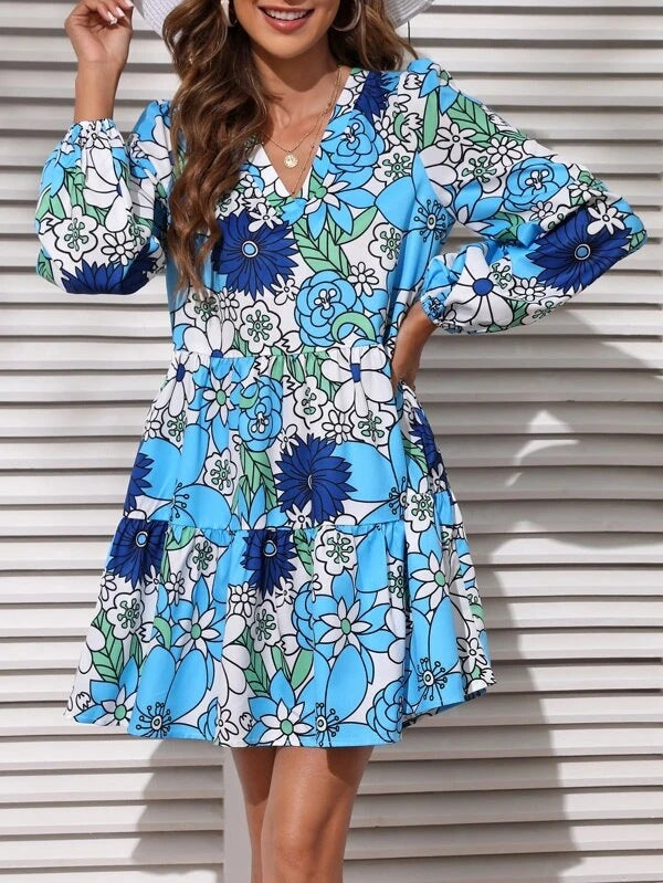 طباعة الأزهار البيضاء والأزرق فستان طويل الأكمام