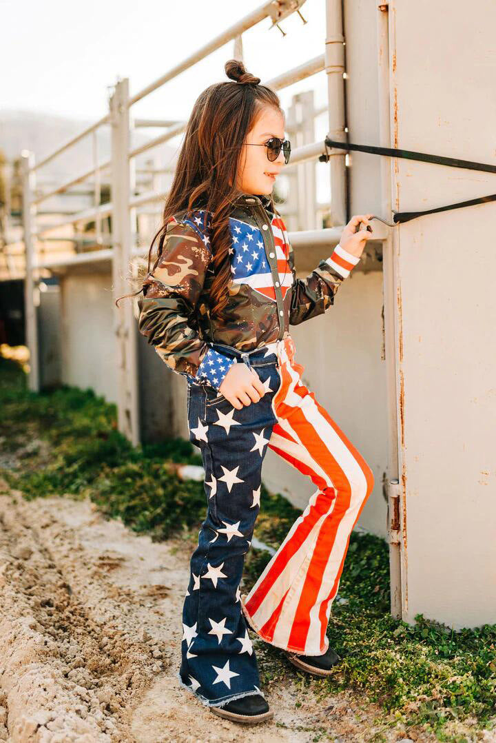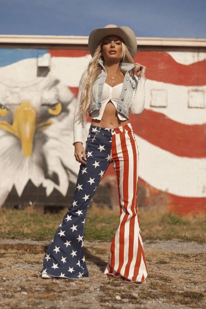 أظهر كبرياءك الوطني الأمريكي هذا الصيف وهو يرتدي النجوم البيضاء والأزرق والأشرطة الجينز. أسفل ساق واحد النجوم الأزرق والأبيض وخطوط حمراء وبيضاء من جهة أخرى.