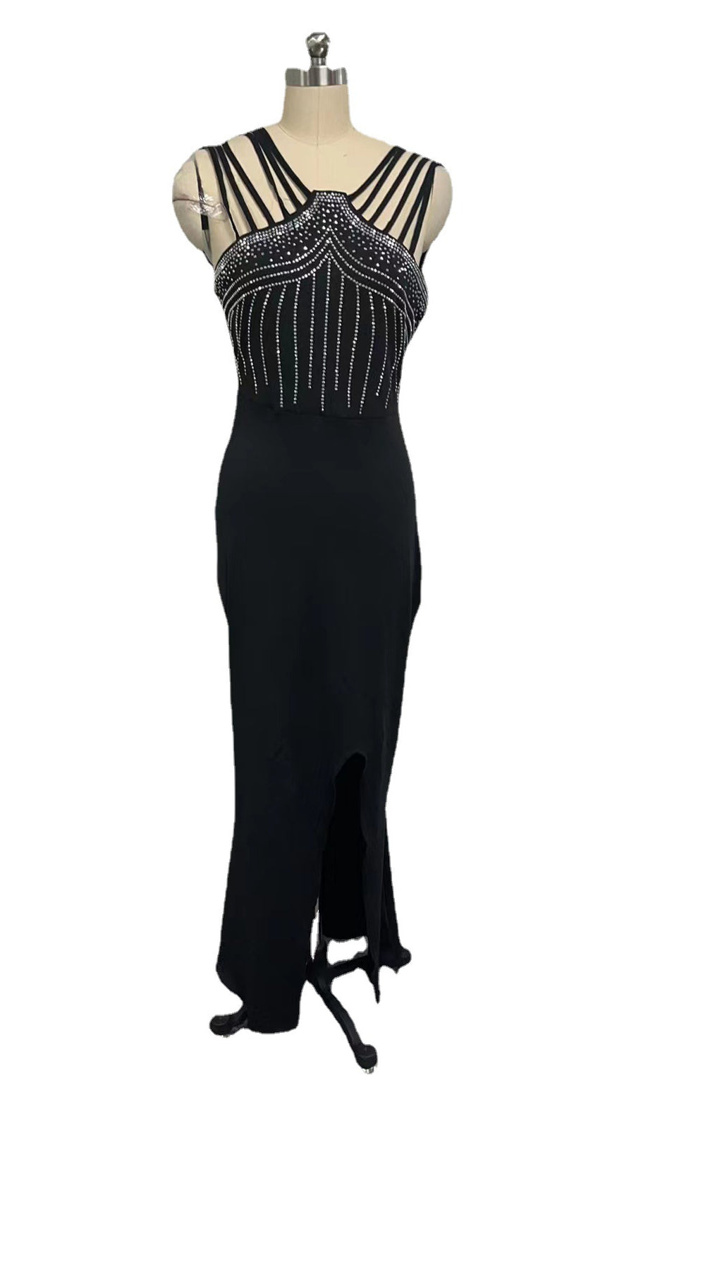 تبرز في المطعم أو النادي في هذا اللباس المتلألئ باللون الأسود والفضي اللامع اللامع الذي يتميز بنسج لامع وأشرطة كتف فريدة من نوعها.
