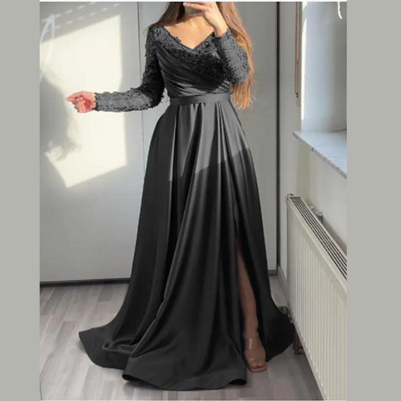 فستان ماكسي ذو الأكمام الطويلة مع رقبة وشق الفخذ