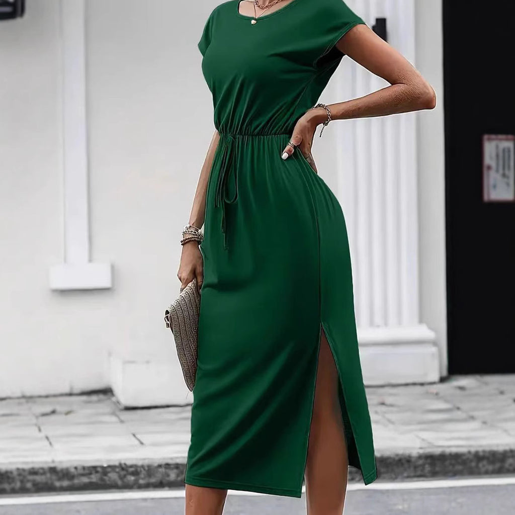 Dieses schlanke Kleid verfügt über eine festgezogene Taille und einen klassischen runden Ausschnitt für entspannte Eleganz. Aus dehnbarem, atmungsaktivem Stoff gefertigt, ist es ideal für Besorgungen oder Kaffee. Kombiniere dich mit Turnschuhen für Tag oder Absätze für ein kurzes Abend -Upgrade.