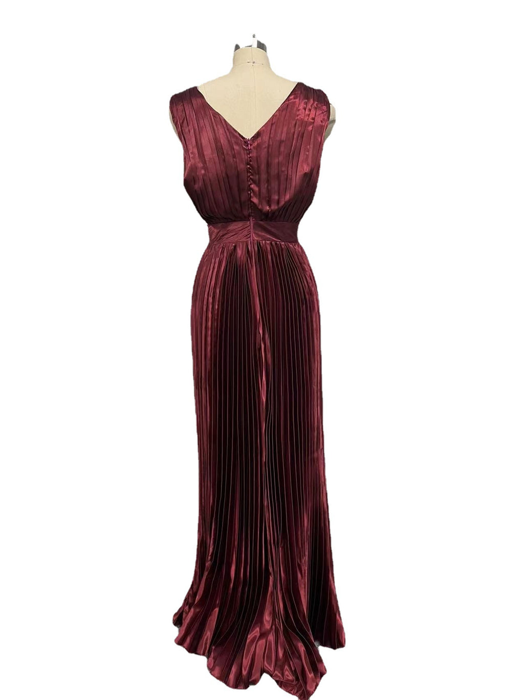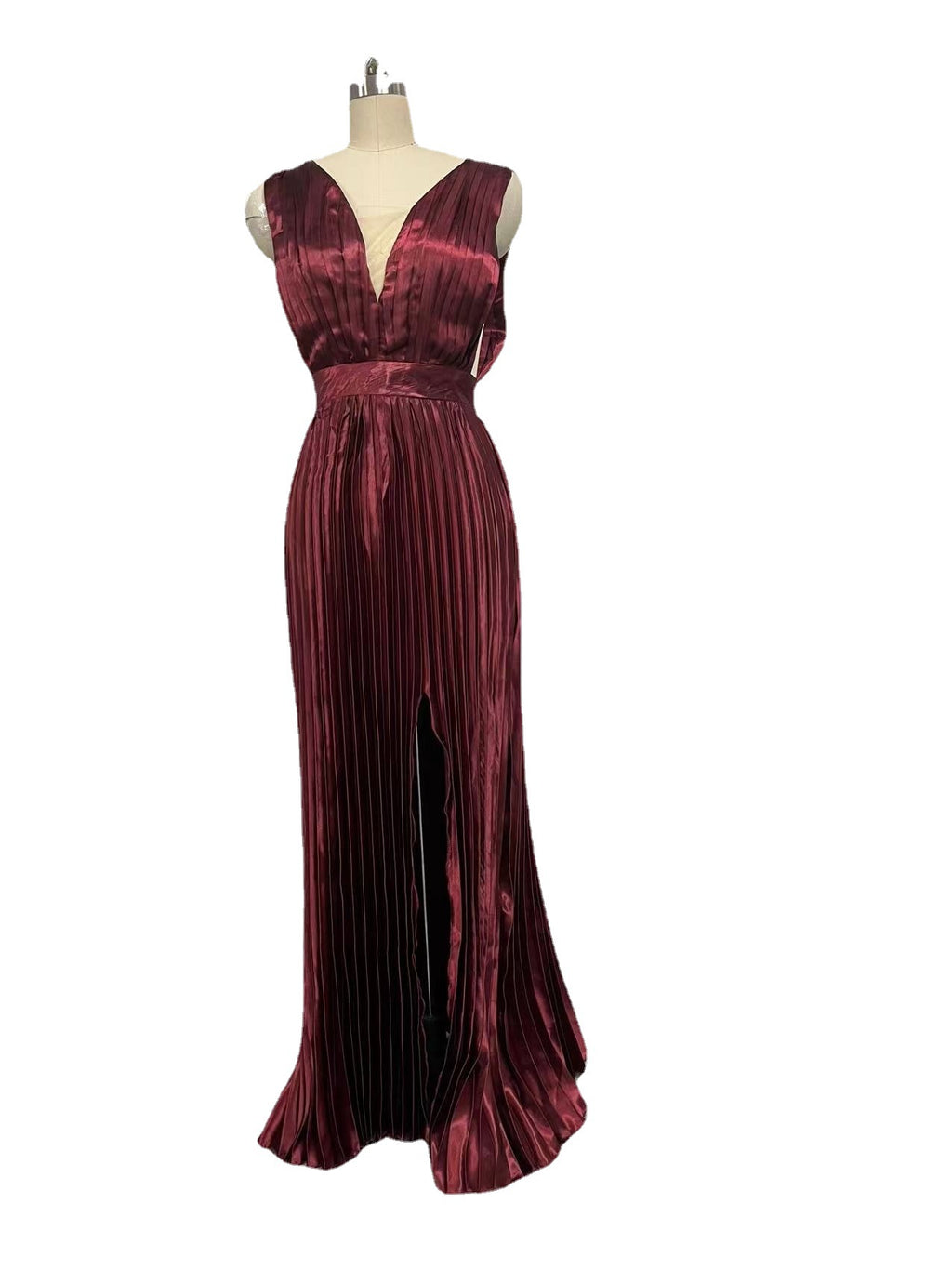 Treten Sie stilvoll in den Raum und tragen Sie dieses ärmellose Maxikleid mit V-Ausschnitt für Damen und angezogener Taille, das aus seidigem, satiniertem Material besteht, das bis zum Boden reicht. Seine satte Farbe trägt zum auffälligen Glanz bei.