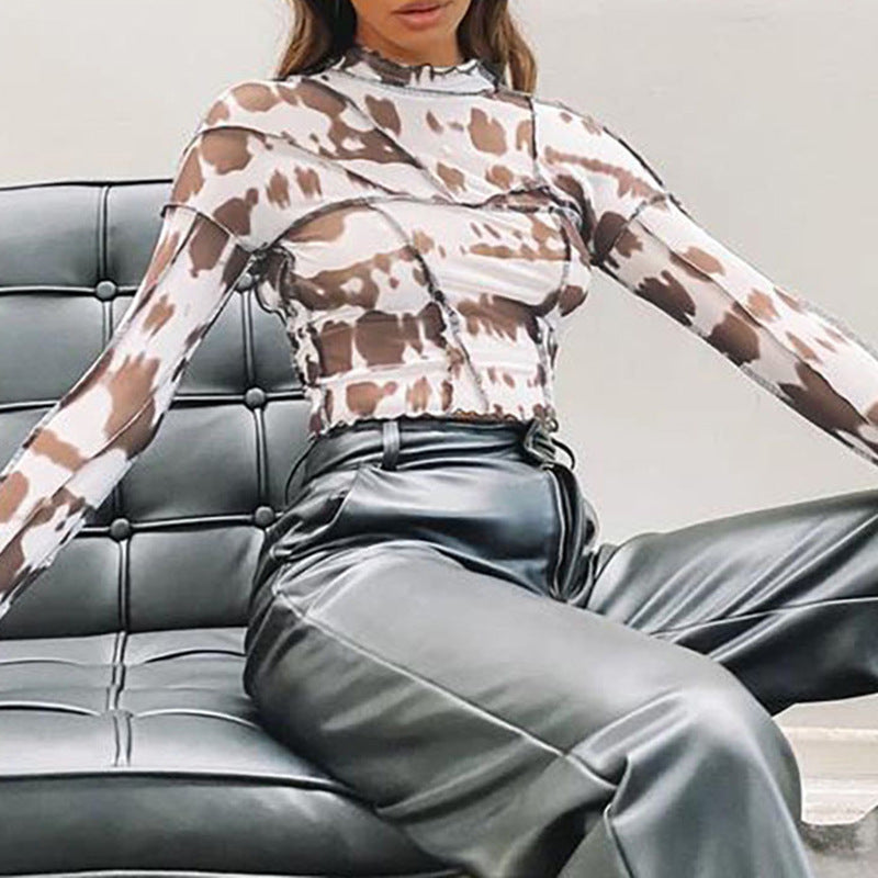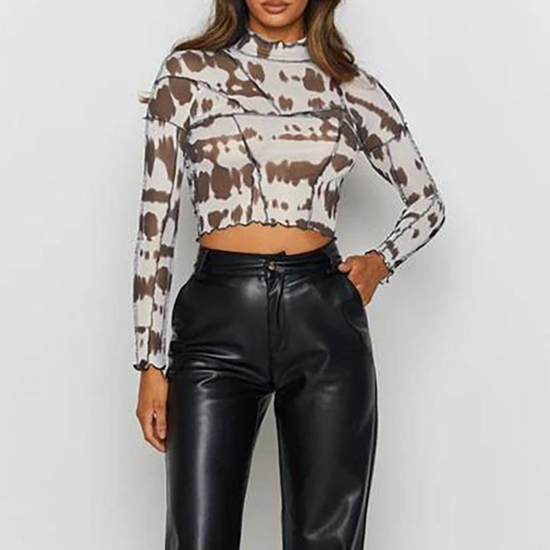 Make a stylish statement with your casual ensembles wearing the Women's Long Sleeve Backless Crop Top with Mock Neck. It comes in a creamy off-white and brown pattern.