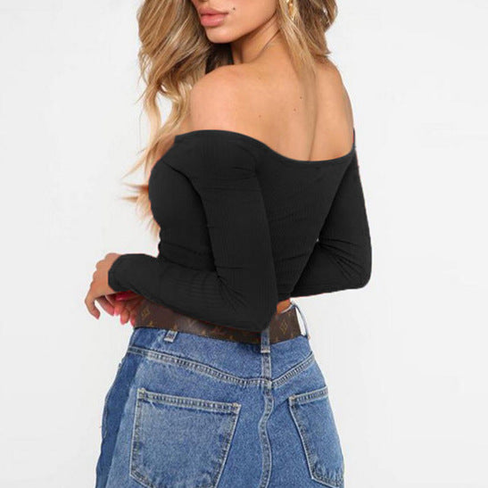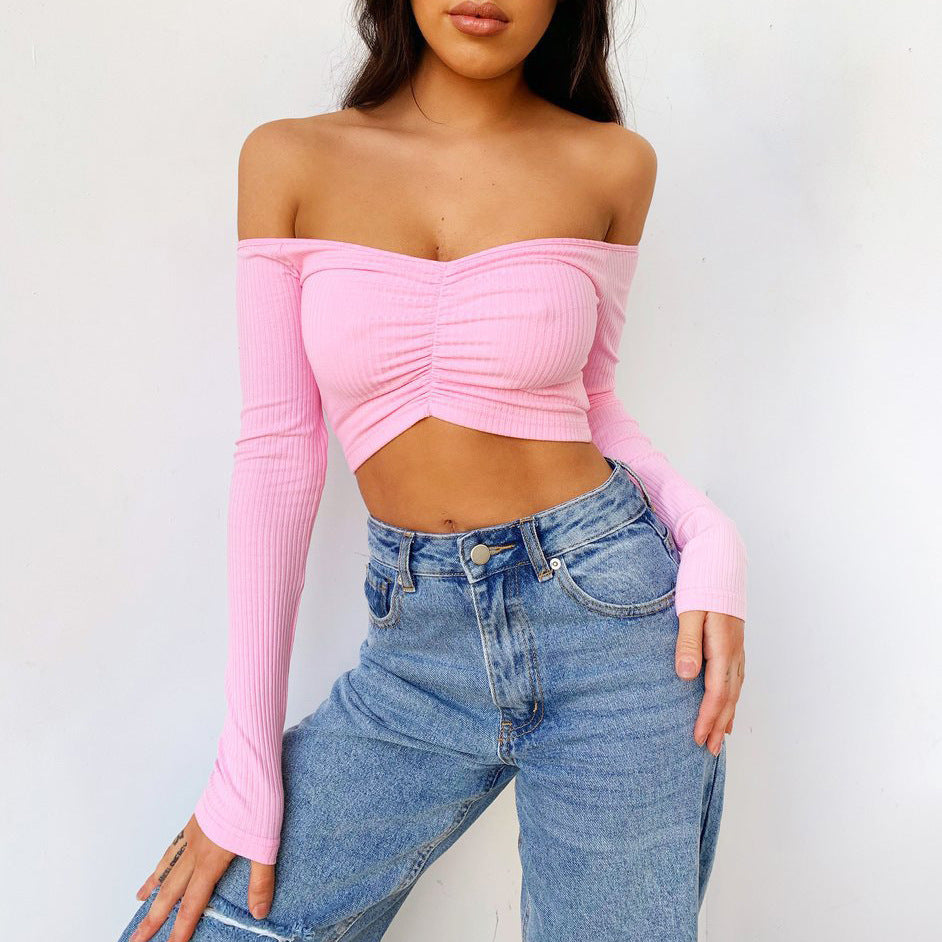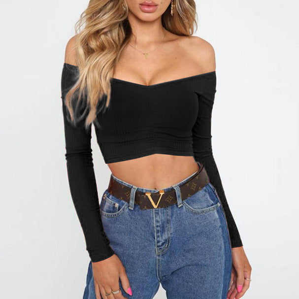 Make yourself stand out in a crowd wearing the Women's Long Sleeve Crop Top with V Neckline. It features low, off the shoulder sleeves and a knitted look.