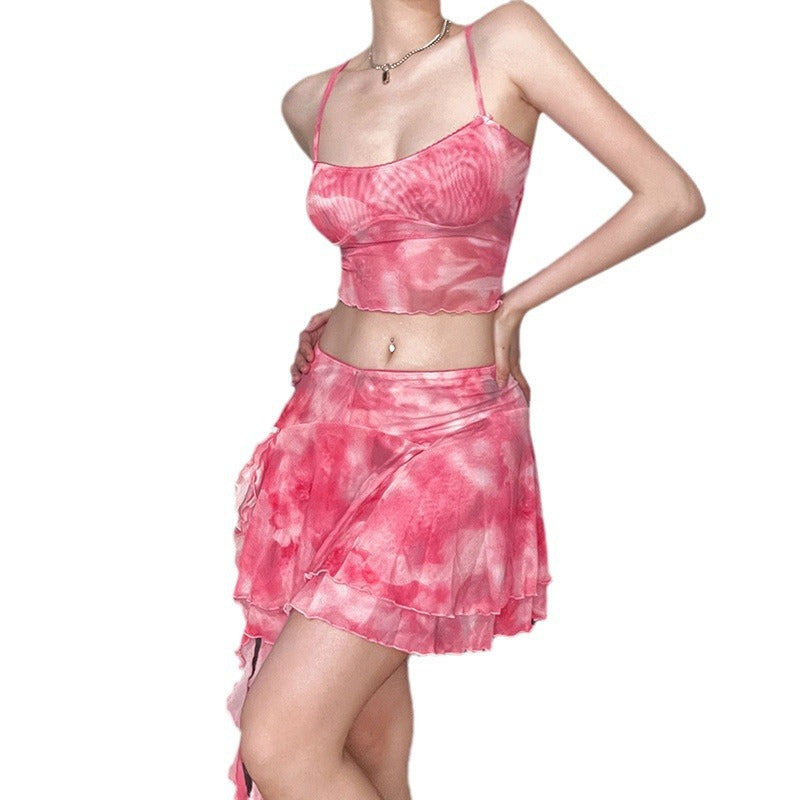 Get inspired by 90s fashions with the Women's Two Piece Crop Top and Skirt Set. This pink and white set features a spaghetti strap top and a flowy, lightweight mini skirt.