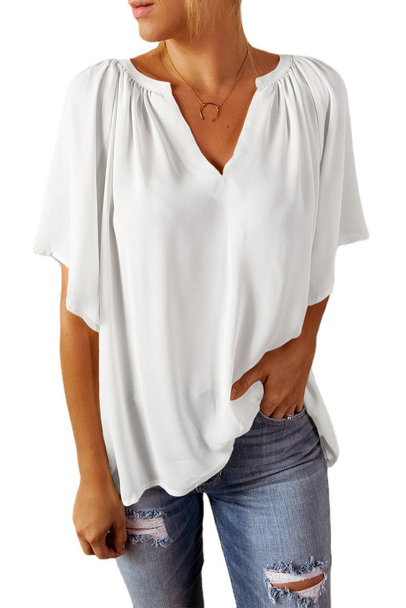 Luce linda sin ningún esfuerzo usando esta cómoda blusa holgada con cuello en V y manga tres cuartos. Cuenta con un dobladillo largo y un material sedoso que te hace sentir sin restricciones en tus movimientos.