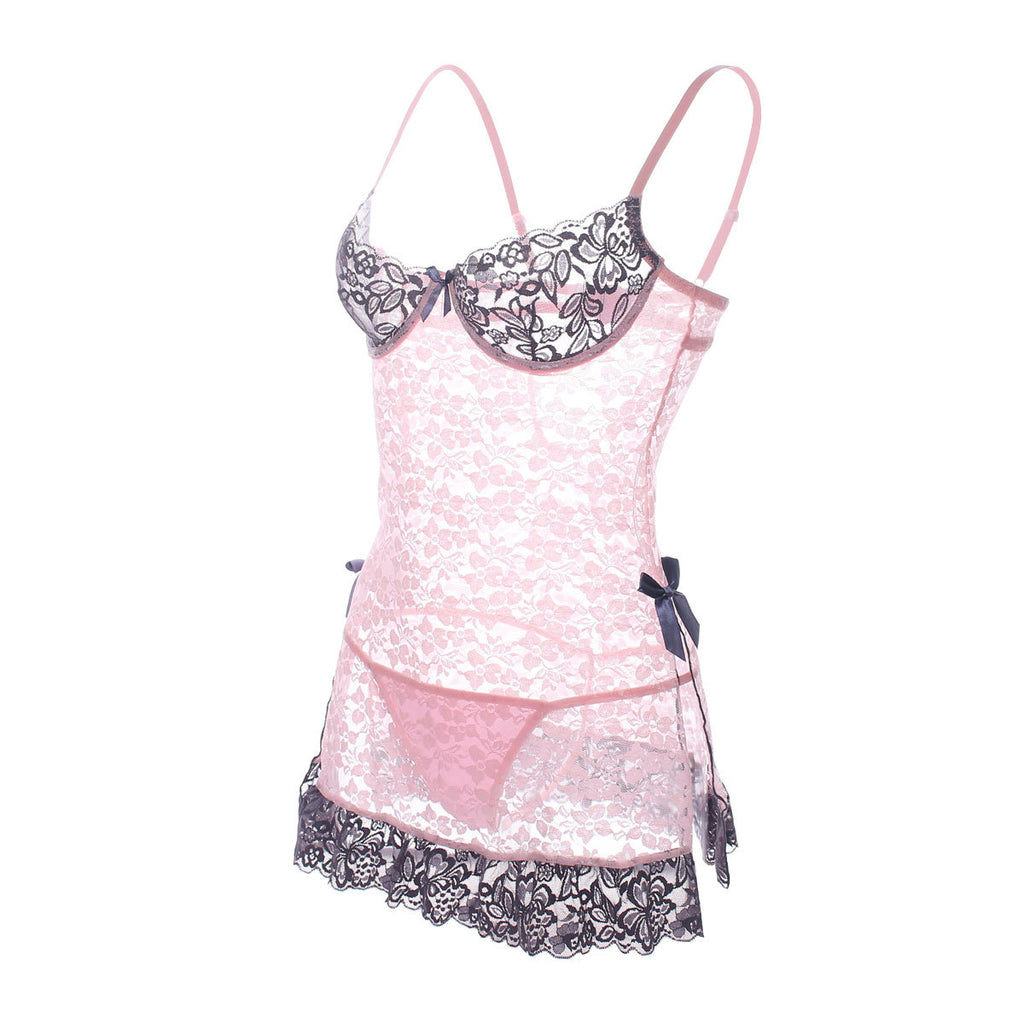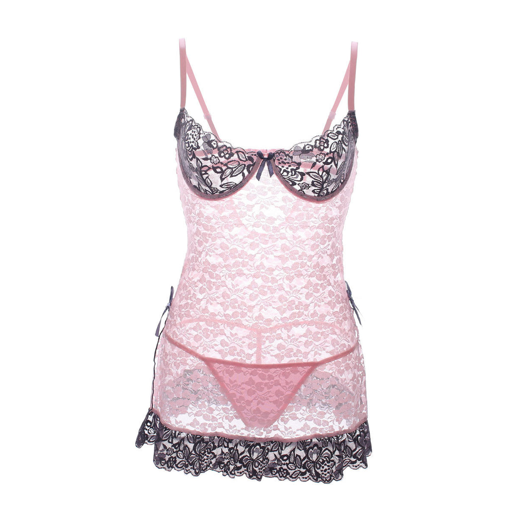 Siéntete guapa en rosa cuando te pongas el conjunto de lencería babydoll con falda y copa de encaje, con copas negras, encaje negro alrededor del dobladillo y encaje rosa en el medio.