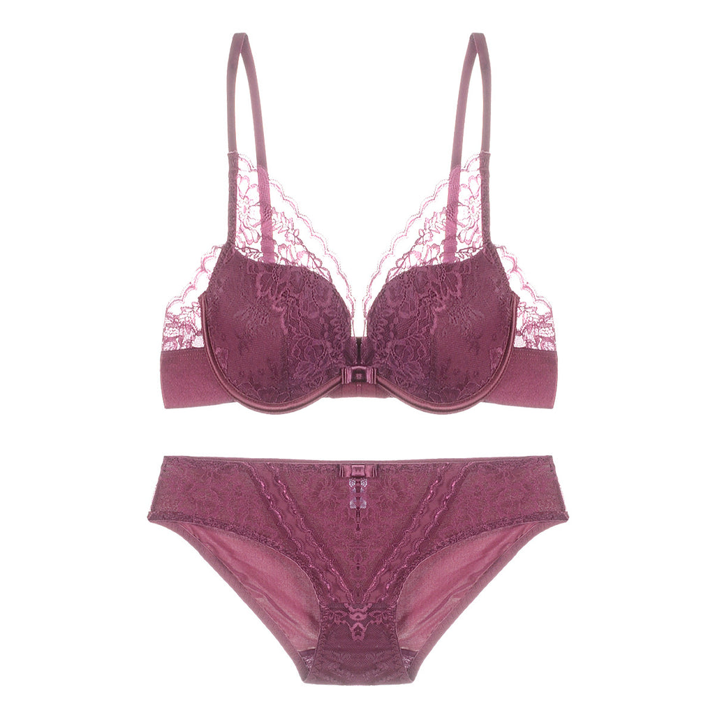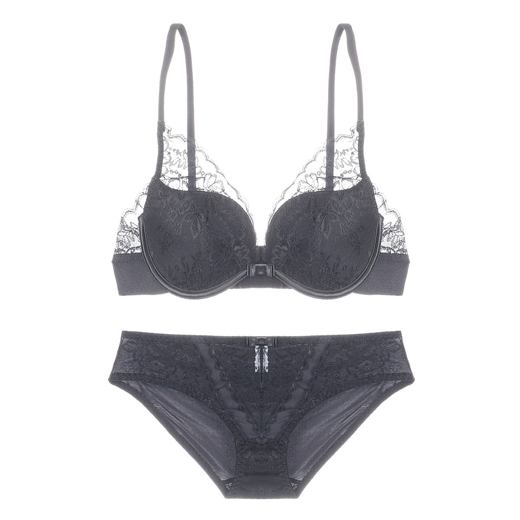 Un adorno de encaje simple y delicado alrededor del sujetador es todo lo que necesita el conjunto de sujetador y panty superpuestos de encaje para sobresalir como un conjunto romántico.
