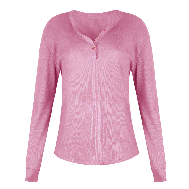 Manténgase abrigado este otoño con el suéter tejido con cuello en V para mujer con bolsa tipo canguro. Este suéter presenta su elección de colores sólidos, cada uno con cuello en V abotonado y mangas largas y cómodas.