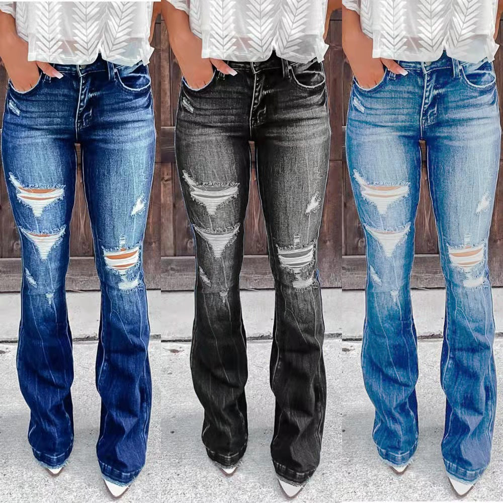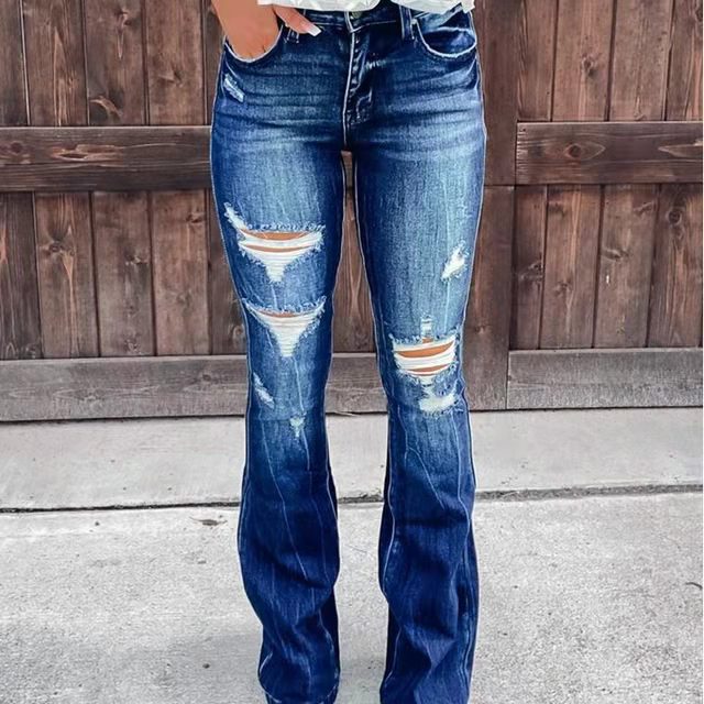 Jeans en jean de la jambe évasée des femmes avec des déchirures