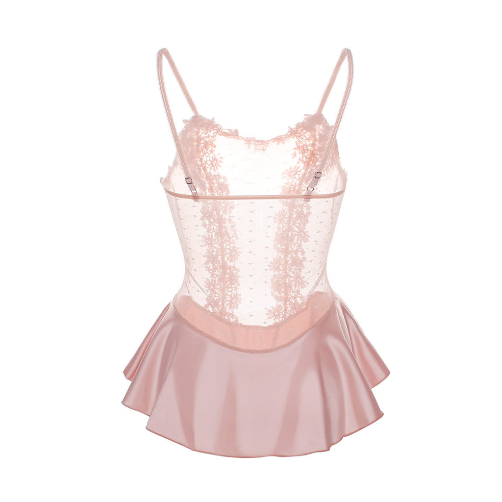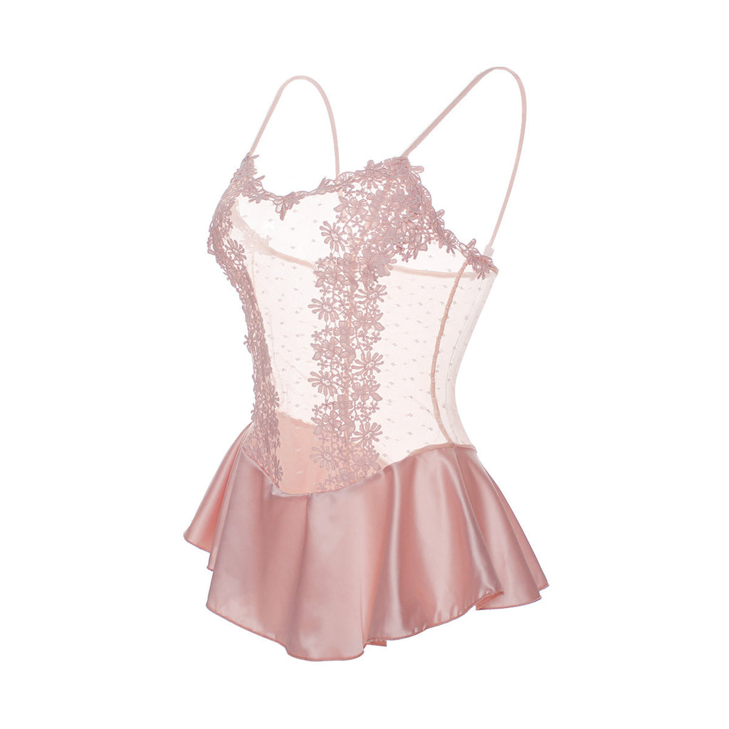 Tentz votre amant dans ce délicieux et délicieux corsage en dentelle Peekaboo en peluche avec un contour en dentelle et une jupe courte soyeuse, soyeuse et soyeuse.