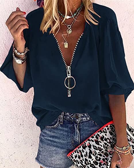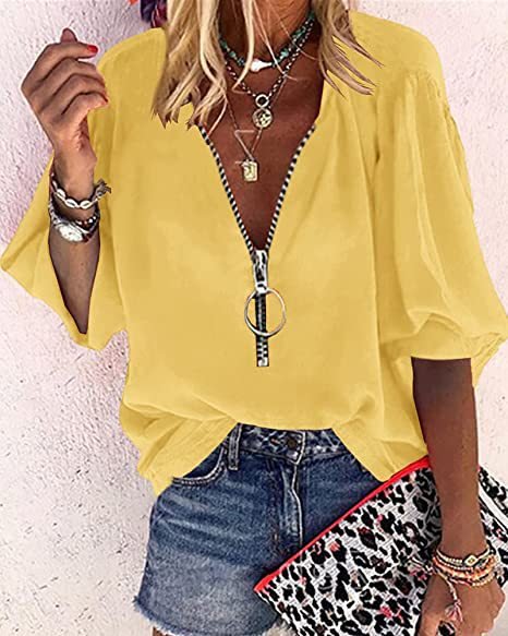 इस बोल्ड जिपर में बाहर खड़े हो जाओ लंबे समय तक आस्तीन वाले वी-नेक महिलाओं के शीर्ष। इस शर्ट को इसके ओवरसाइज़ जिपर पुल की विशेषता है जो कि थेड्रामैटिक, कम वी-नेक फ्रंट बनाता है। यह विभिन्न रंगों में आता है।