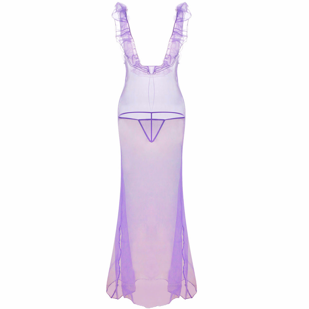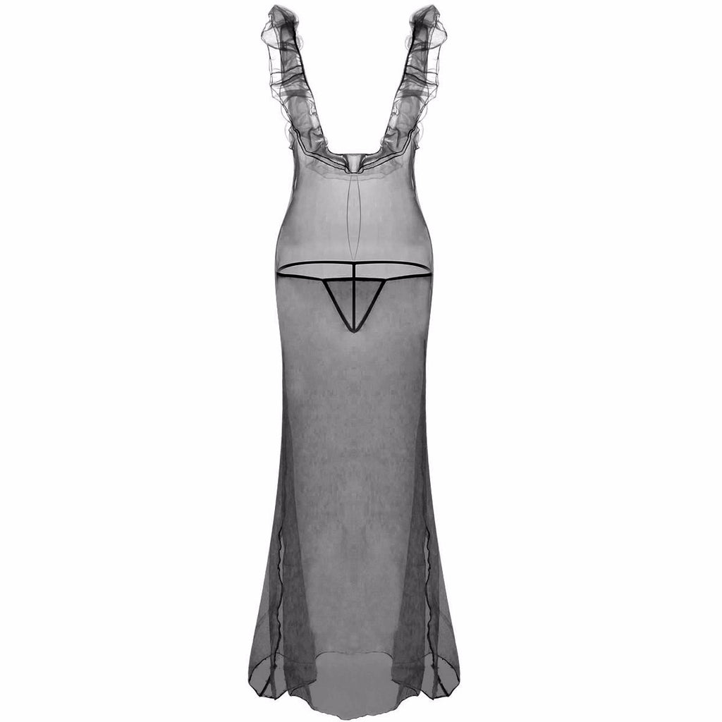 Banding seks tetes dari head to toe di gaun lingerie depan yang sangat seksi yang menampilkan tali berenda, leher rendah drop, dan hem sepanjang lantai.