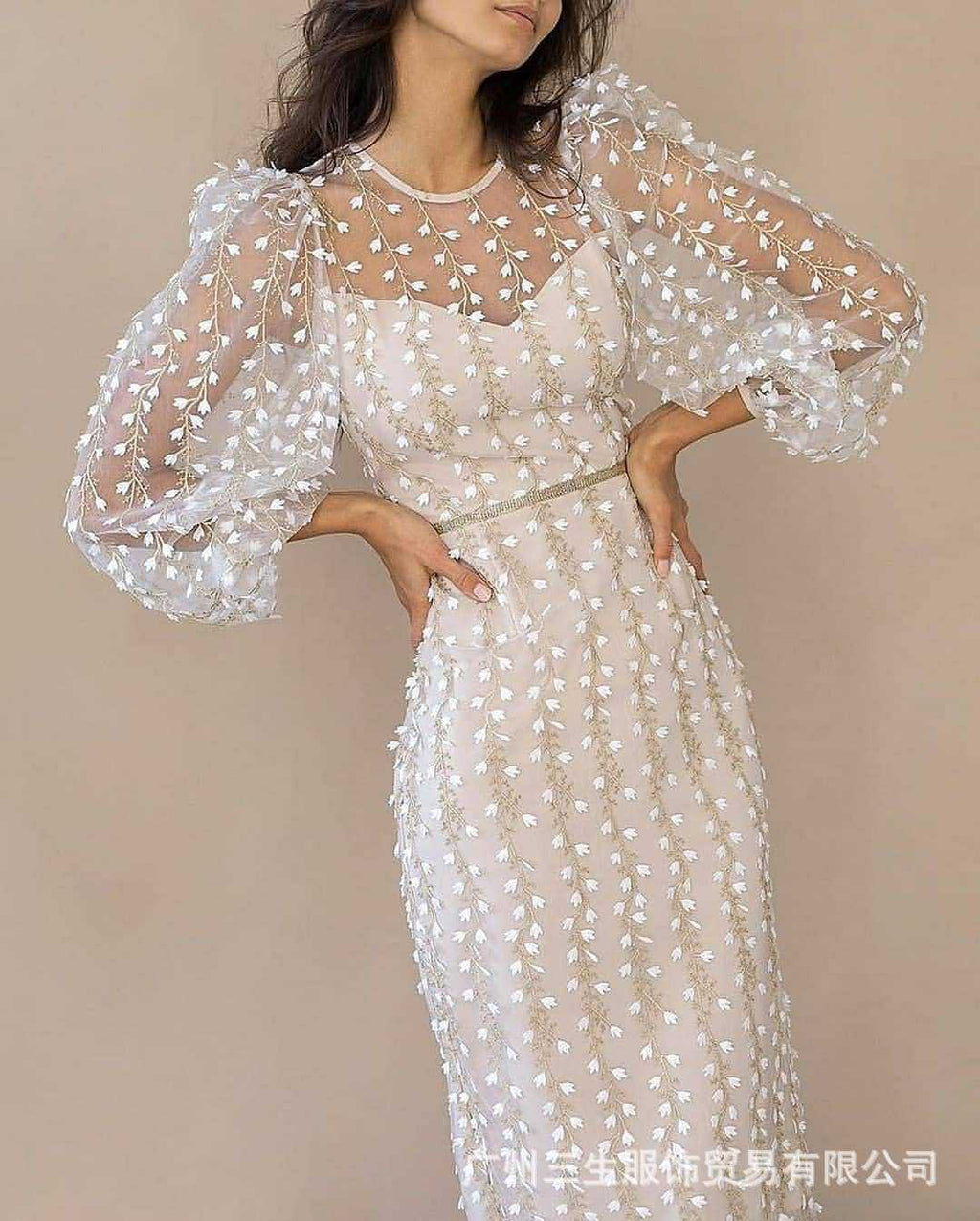 Mengenakan gaun putih wanita dengan bahan semi-sheer polka dot adalah gaun yang menarik yang cukup pas untuk memberikan bentuk gaun. Ini memiliki hem midi yang duduk tepat di bawah lutut.