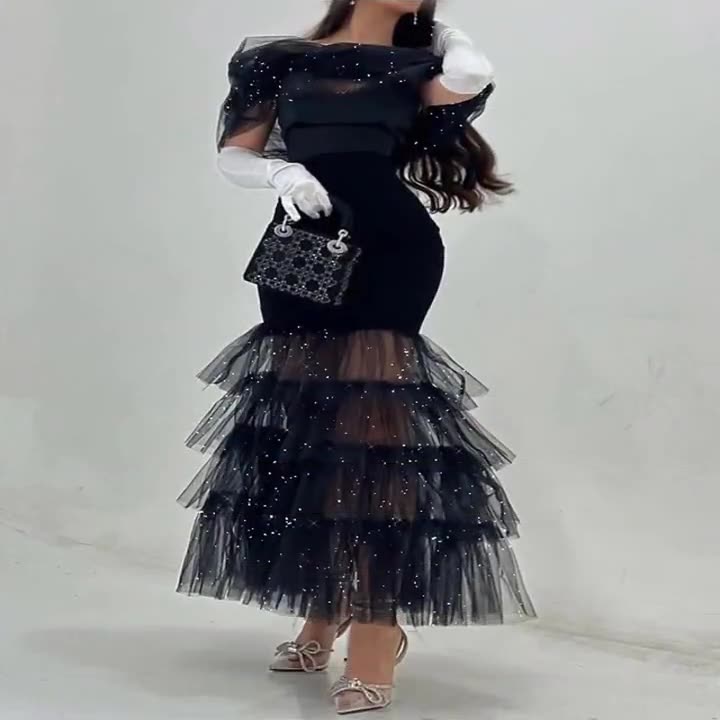 Forma abito nero adatto con maniche trasparenti e gonna a più livelli