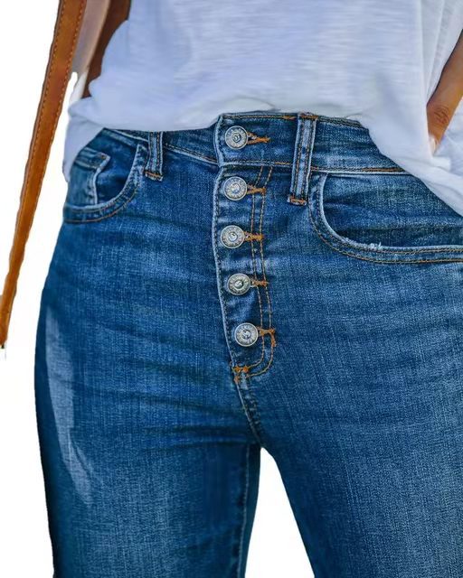 Torna agli stili di una volta quando indossi la gamba ampia delle donne con le ginocchia strappate. Lungo la parte anteriore di questi jeans ci sono cinque pulsanti verticali che aggiungono alcuni dettagli al look.