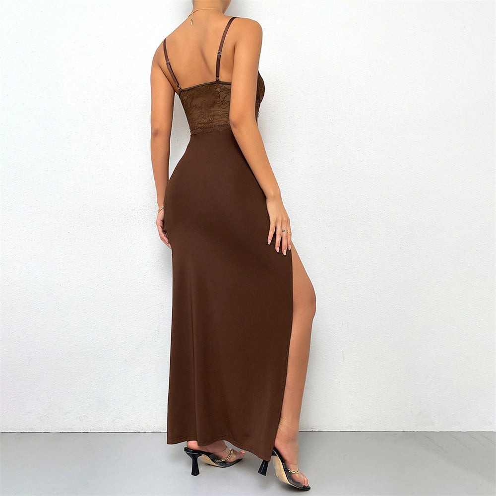 Turn heads on date night wearing the Women's Spaghetti Strap Dress with Lace Bodice. This low-cut dress also has two thigh slits for an alluring look.