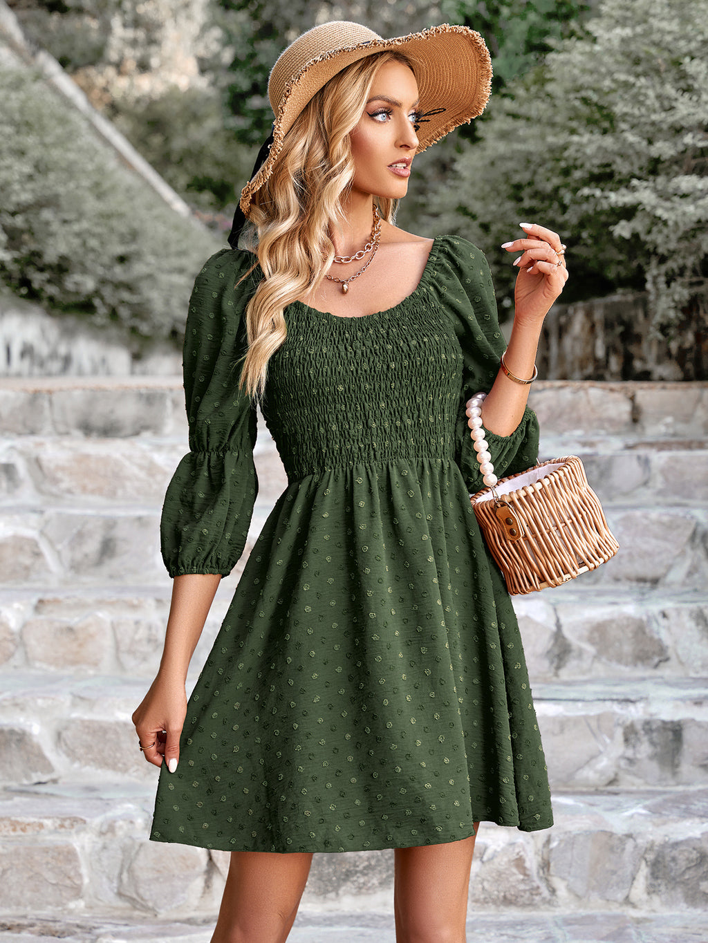 さわやかでキュートで快適な、3分の3の長さの袖を備えた女性のUネックMIDIドレスは、春や夏の外出に最適で、3色があります。