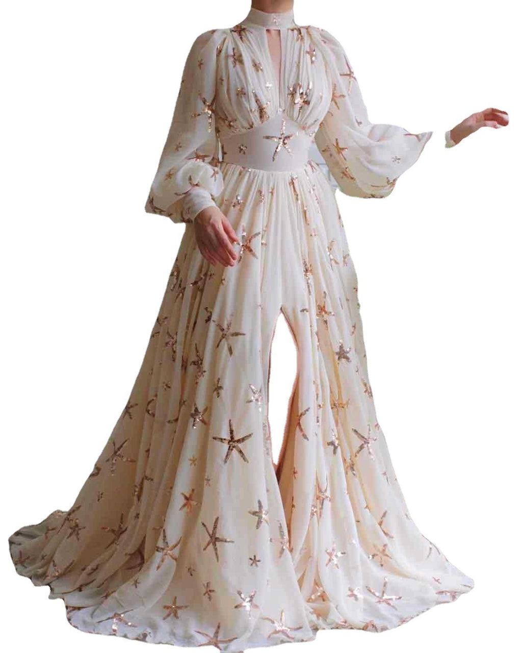 模擬首の女性の長袖のヒトデのドレスを選択するとき、あなたのフォーマルウェアに海のシンボルを持ってきてください。金のヒトデのディテール、鍵穴の首、模擬襟の白い生地が特徴です。