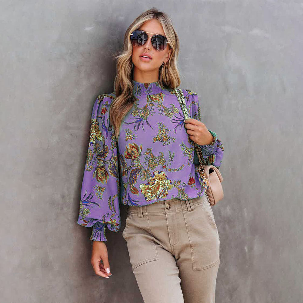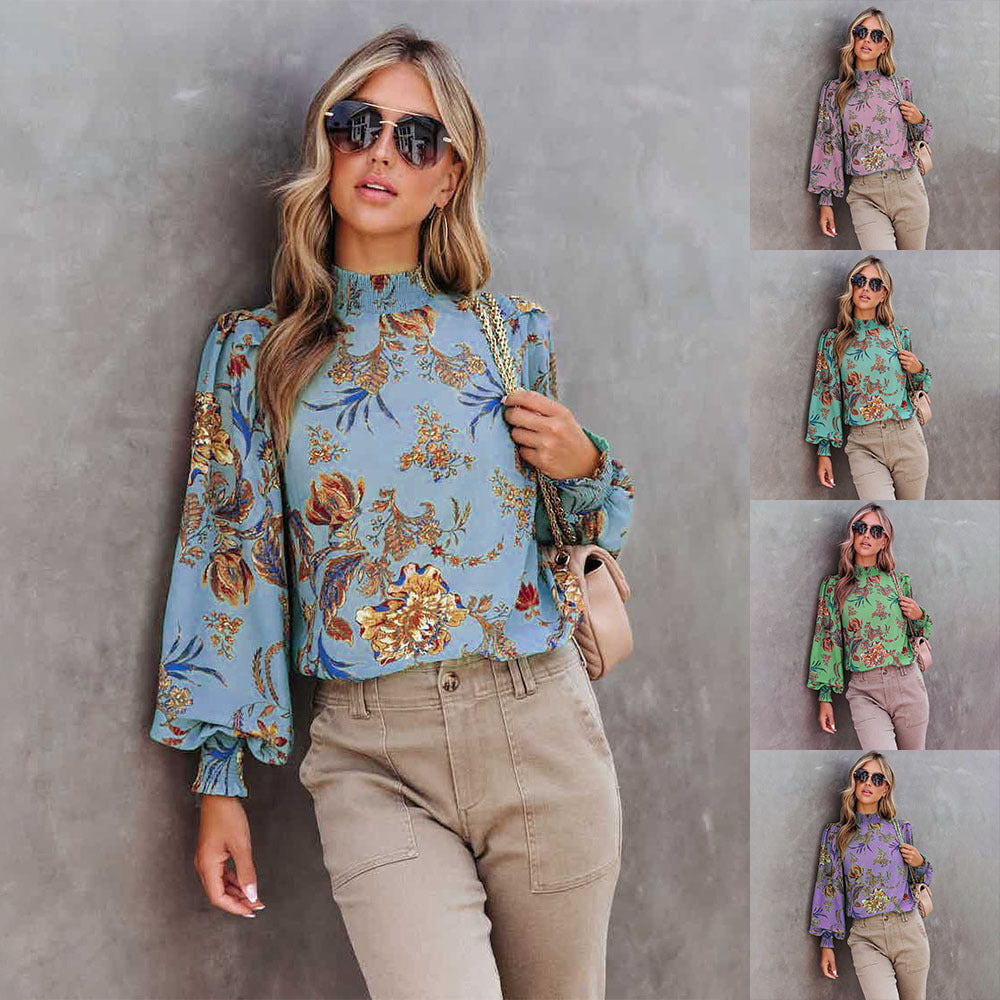 模擬首の女性の長いベルスリーブブラウスを着てカジュアルなルックスをドレスアップします。それは、アンティークの外観を与え、3つのパステル色の色合いで提供されるユニークな植物と花の印刷の詳細を備えています。