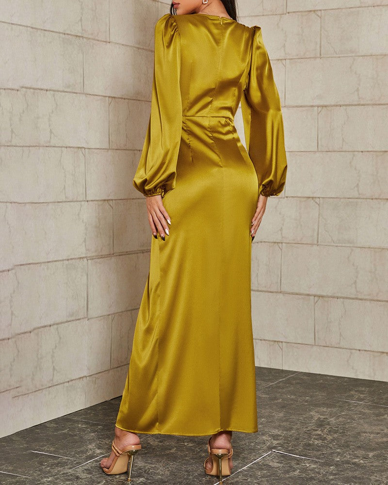 ローカットVネック付きの絹のような長袖ローフィッティングドレス