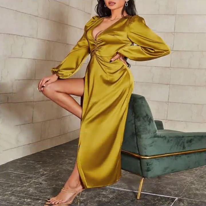 ローカットVネック付きの女性の絹のような長袖の低いドレスを着ているとき、あなたが何をしていても魅力的に見えます。そのゆるい袖はVネックとペアになり、少し軽薄でリラックスした外観を与えます。