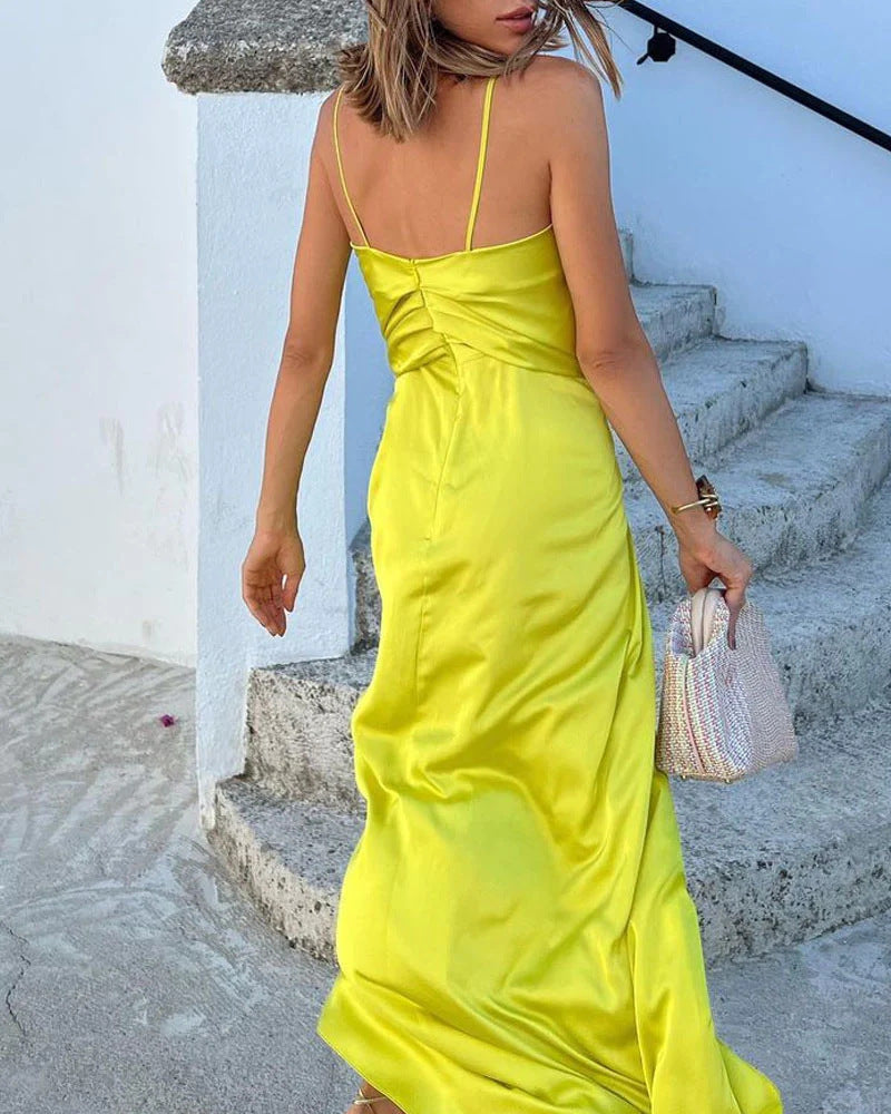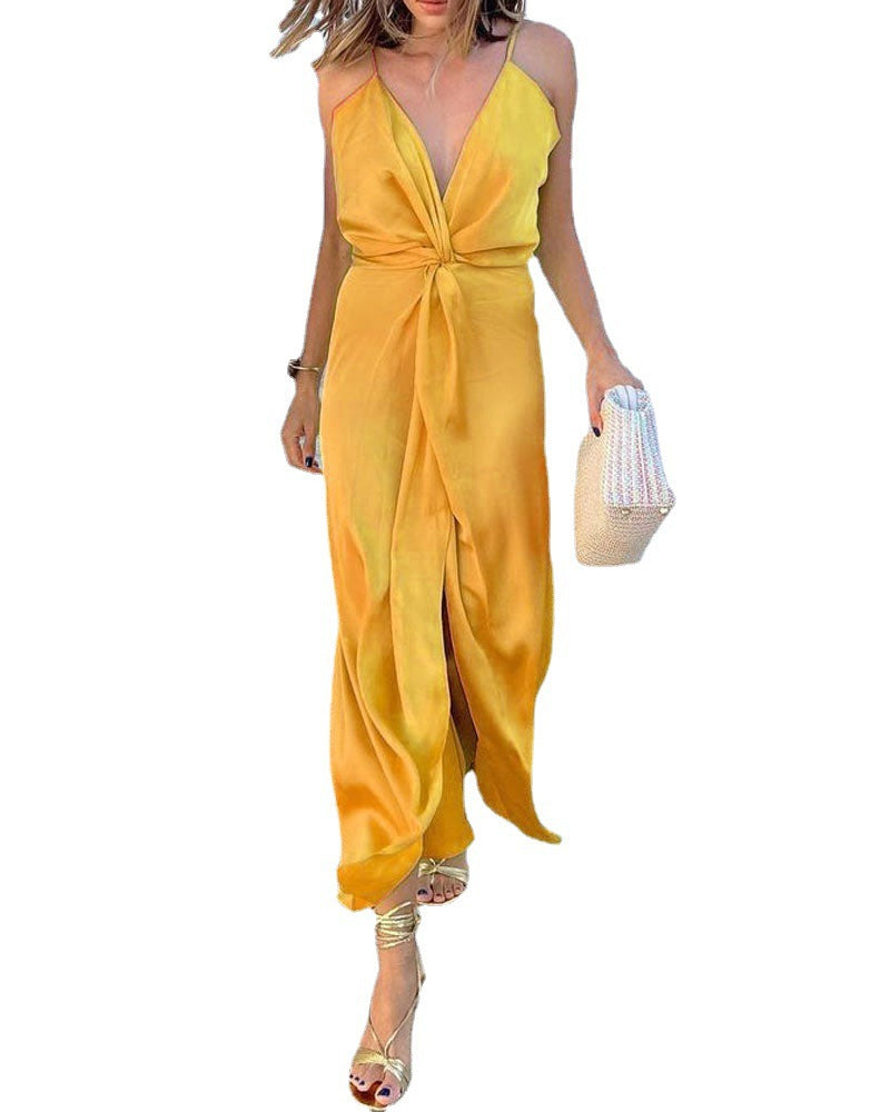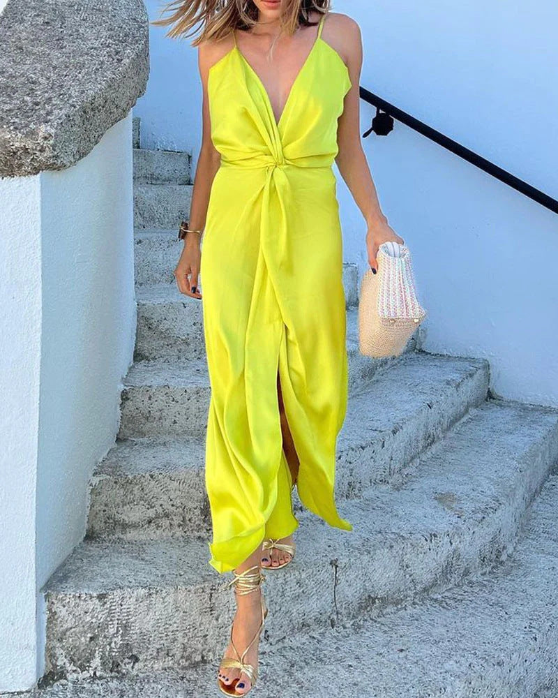 女性のノースリーブの低いVネックドレスを着て部屋に足を踏み入れたら声明を出してください。ゆったりとしたドレスは、黄色、オレンジ、赤のような鮮やかな色の選択肢があります。