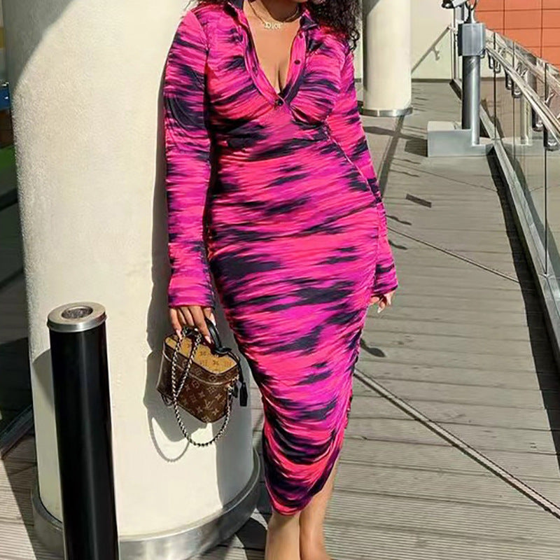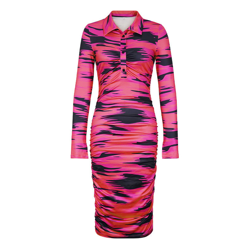 Express your vibrant personality with the Women's Long Sleeve Form Fitting Midi Dress. This vividly colored dress features hot pink, orange and red accented by black and purple.