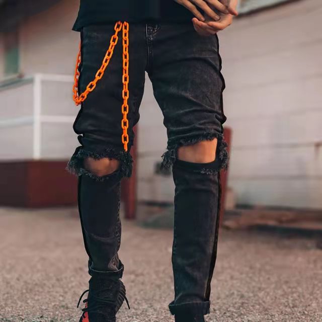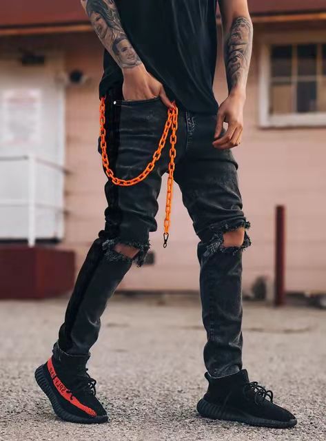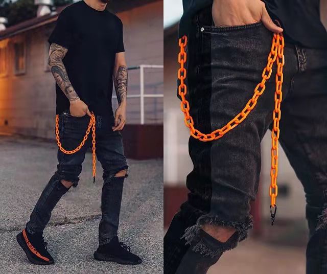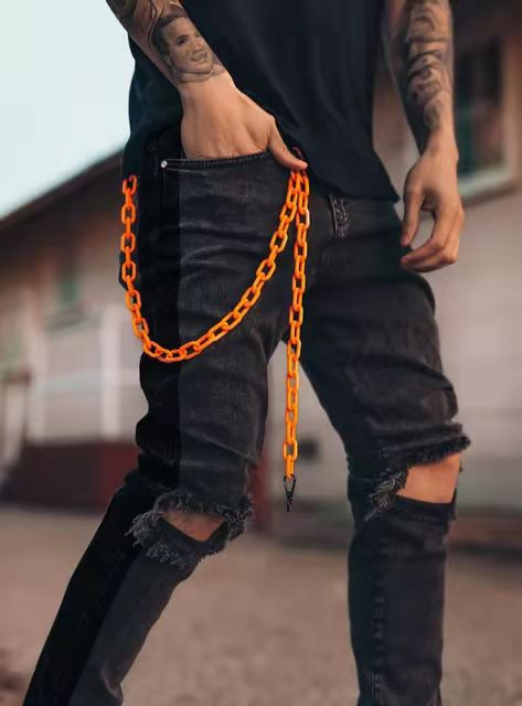 Volg het oog van voorbijgangers op straat met de aandacht die de skinny jeans van heren vastgrijpen met gescheurde knieën en levendige oranje ketting die zeker de hoofden zullen draaien.