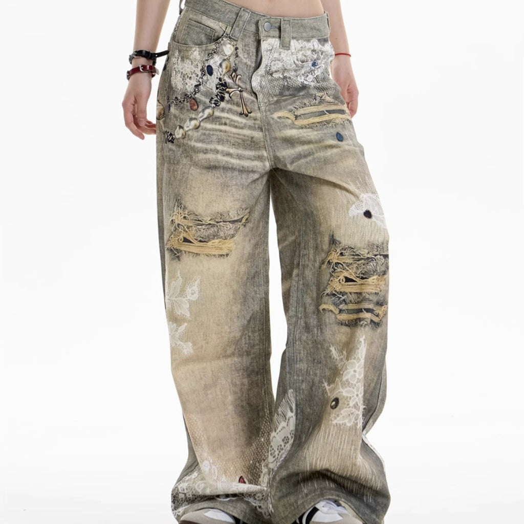 Verklaring cross-print brede spijkerbroek met grafische aantrekkingskracht