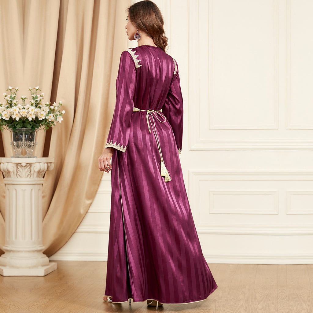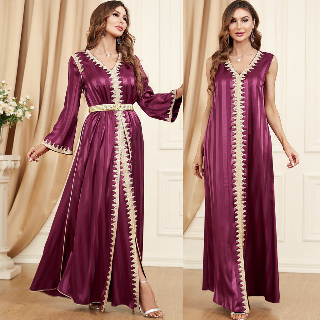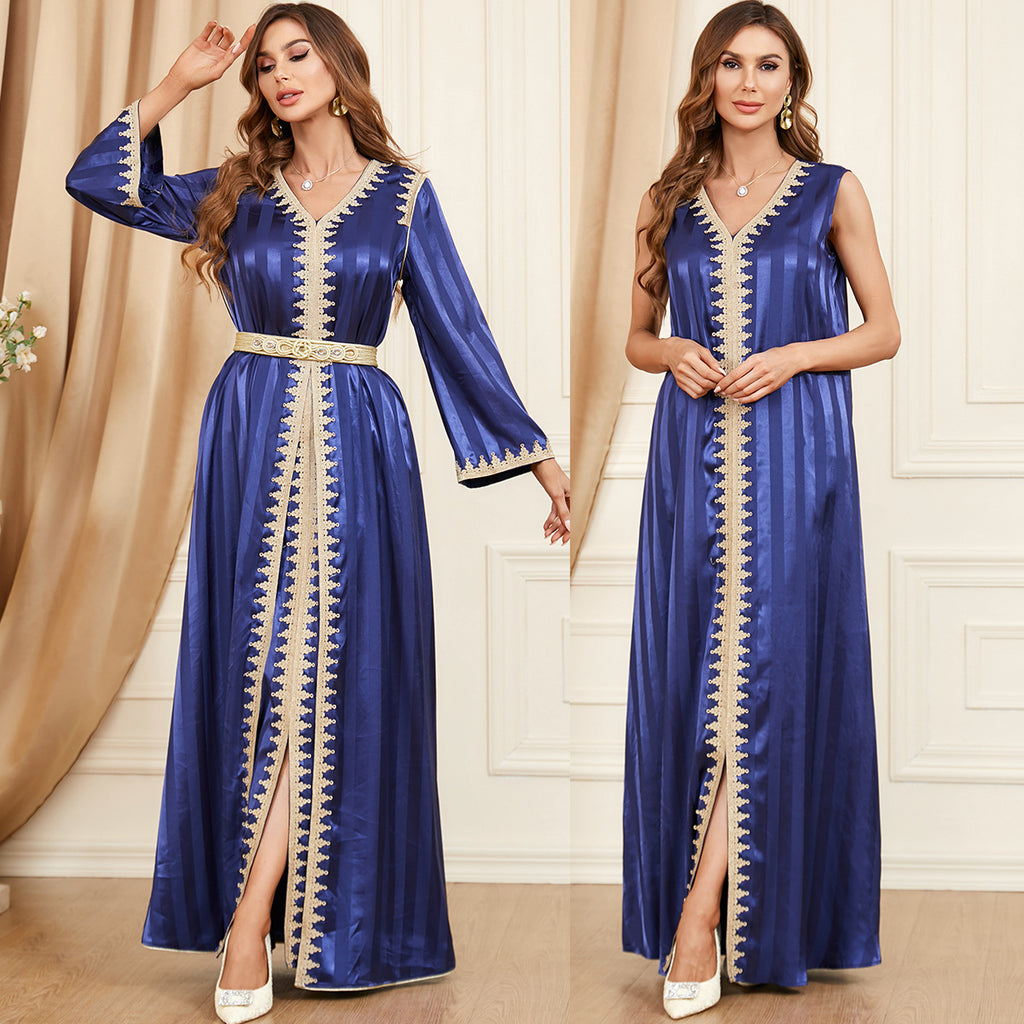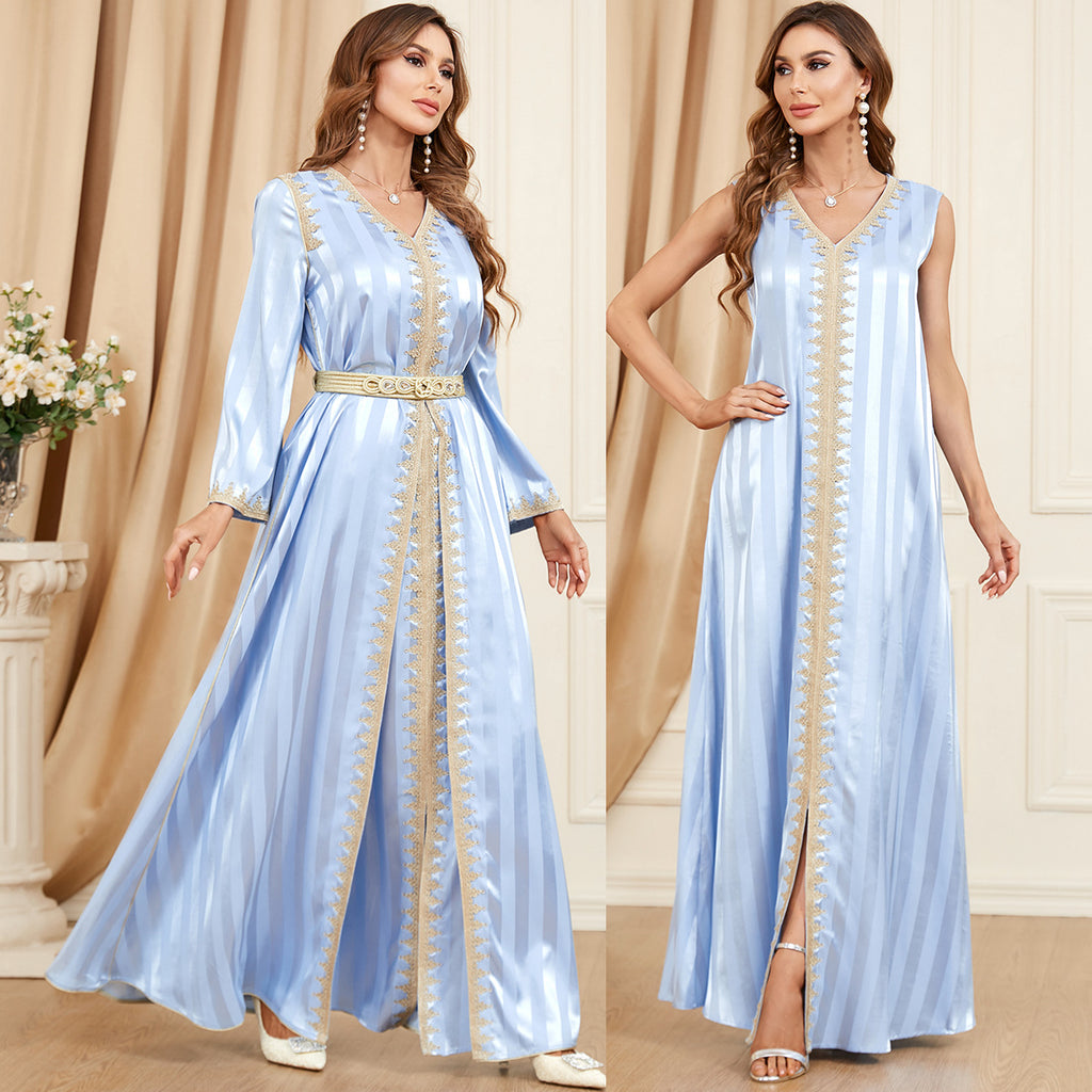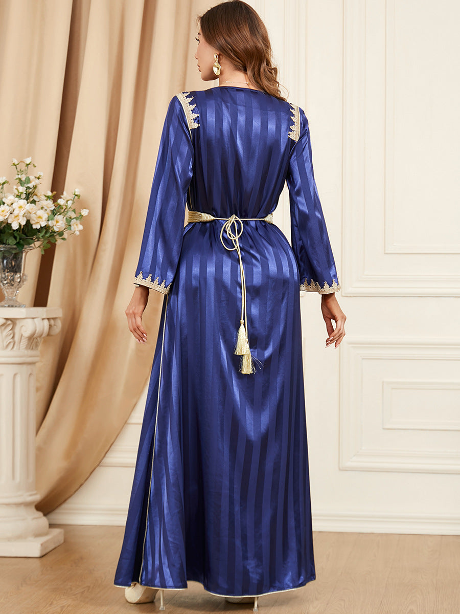 Voel als royalty in de glinsterende maxi -jurk met lange mouwen van de luxueuze dames. Het komt in uw keuze uit karmozijnrode, lichtblauw en donkerblauw met gouden bekleding.