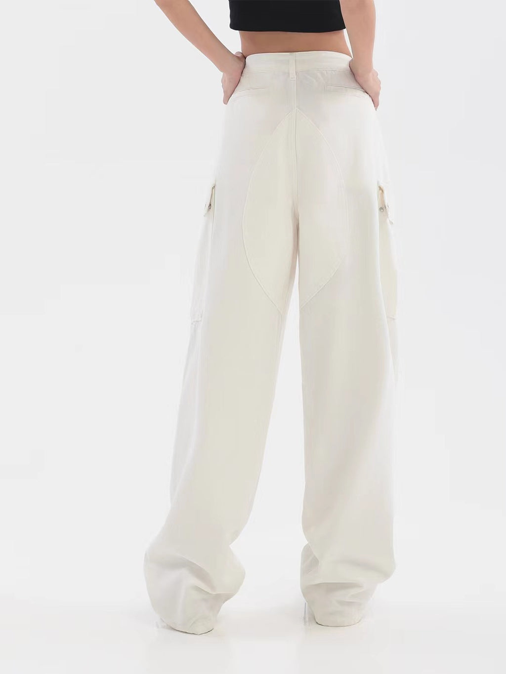 Krijg een schone en comfortabele uitstraling met de hoge taille -pootbroek van de vrouwen met zakken. Ze komen in een slanke, frisse witte tint met een bruine geaccentueerde riem.