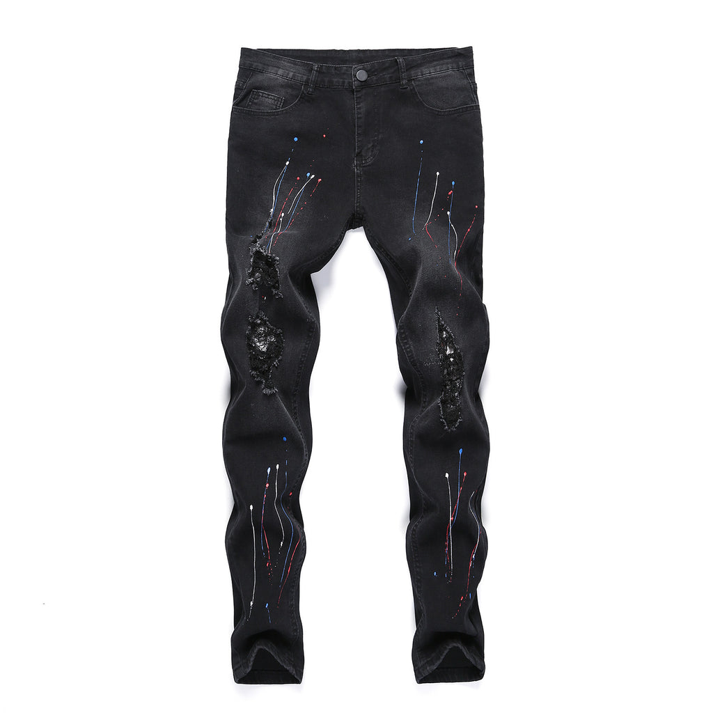 Paint splatters decorate the thighs and shins of the Men's Paint Splatter Dark Denim Jeans, giving them a pop of color. Along the knees are intentional rips to give the jeans a worn look.