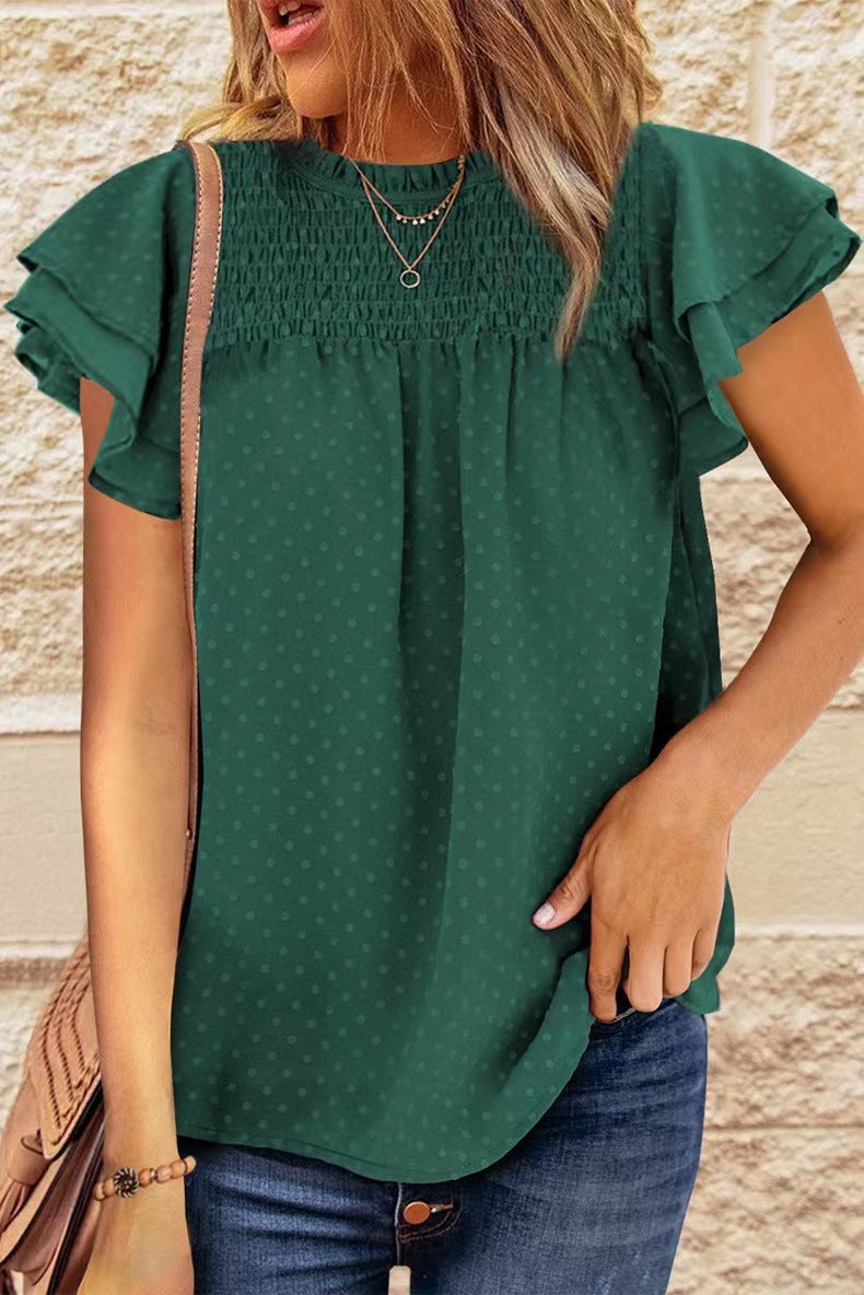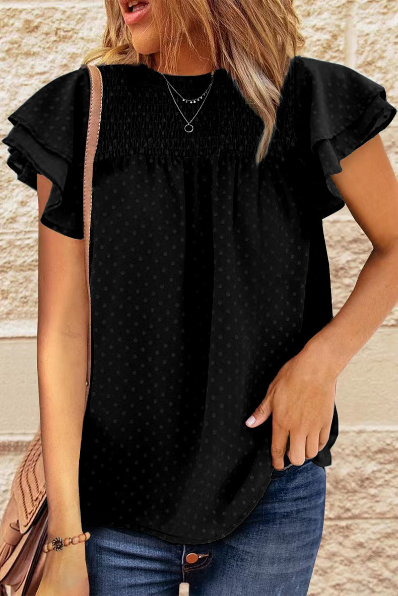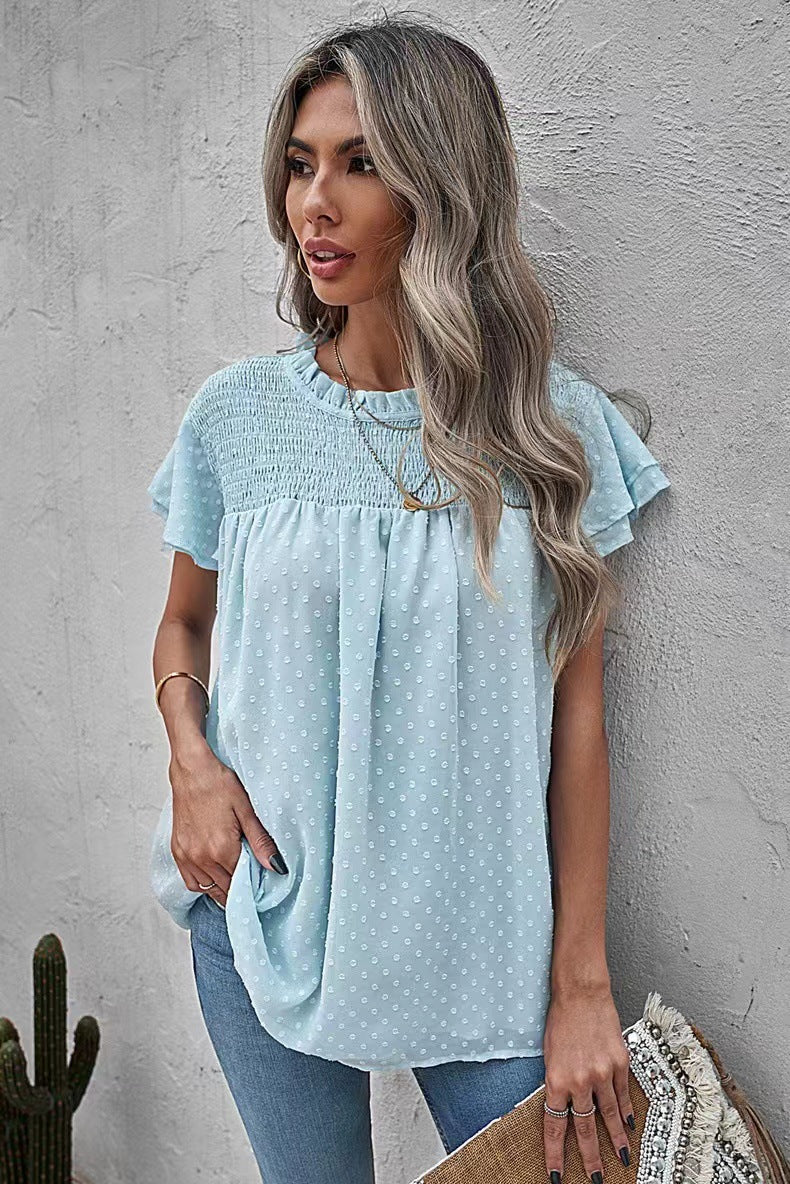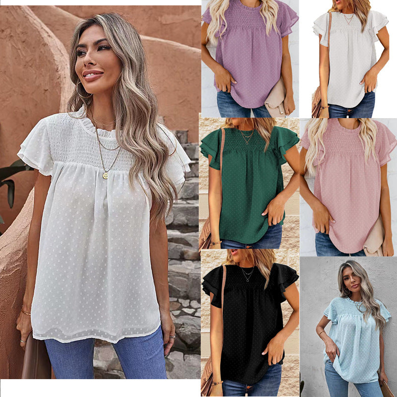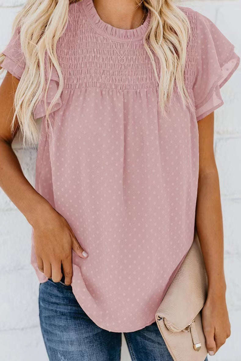 Get a chic, sweet look when you dress in this Women's Short SleeveLacy Loose Fitting Blouse. This shirt features lacy ruffles along the sleevesand polka dots on the shirt itself for contrast.