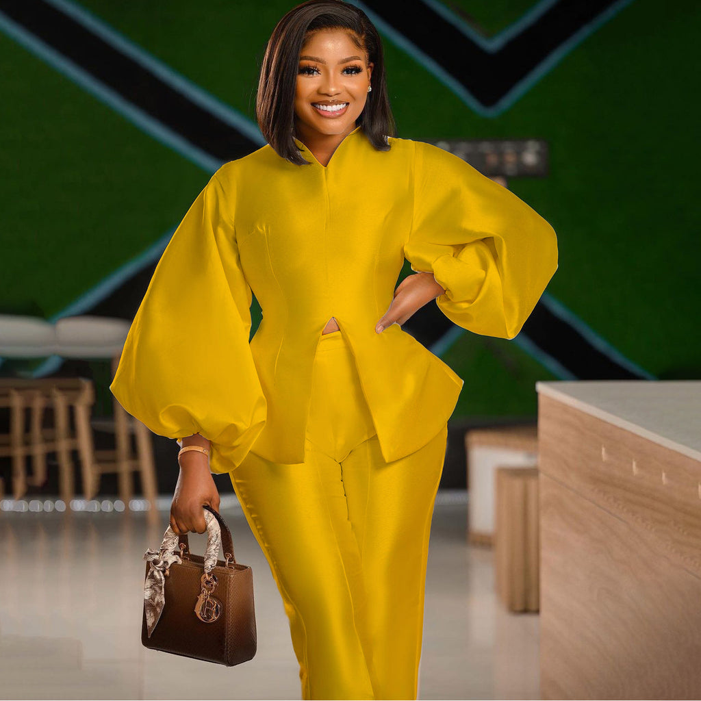 You will be the epitome of class and sophistication wearing this women’s pant suit. This gorgeous two-piece features a peplum-style top with an elegant mock neck and exaggerated balloon sleeves that instantly make a statement, while the center split detail at the front adds an element of interest. The matching pants have a high-rise waist to flatter your feminine figure, finished with seams to give a tailored fit. The fabric has a luxurious sheen that makes this two-piece pant suit ideal for business and formal occasions. Pair yours with pin-thin high heels and minimal jewelry pieces for an ideal look.