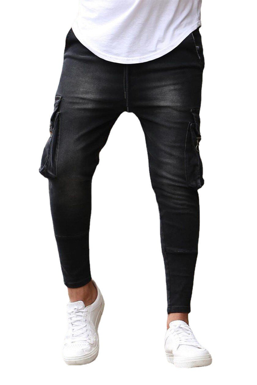 Veja a aparência de jeans skinny um passo adiante quando você usar jeans masculinos com bolsos e zíperes de carga. Os bolsos de carga na coxa oferecem amplo espaço de armazenamento e uma silhueta interessante.