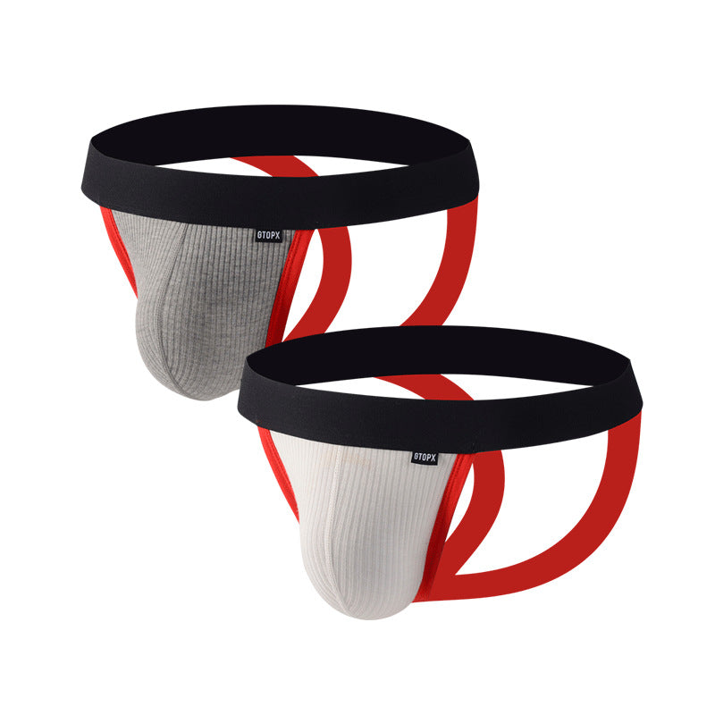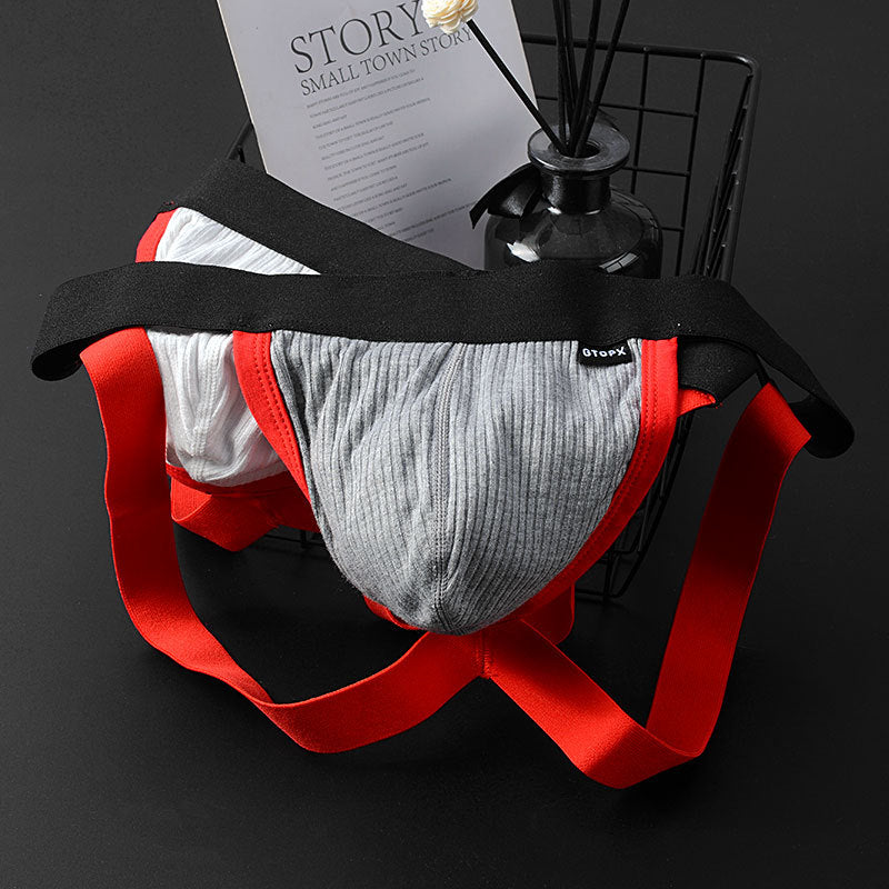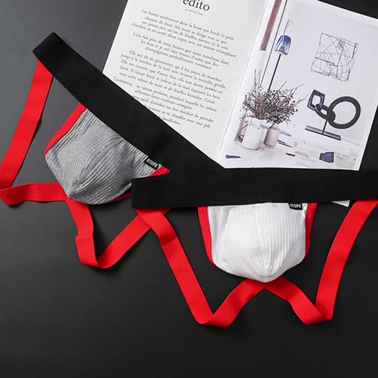 A cueca esportiva de tiras esportivas com bolsa é uma maneira aventureira de se vestir embaixo da sua roupa. A roupa íntima possui uma traseira aberta e uma bolsa branca macia e prende com tiras vermelhas.
