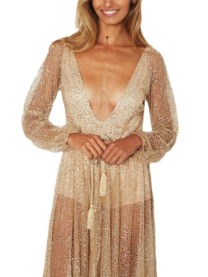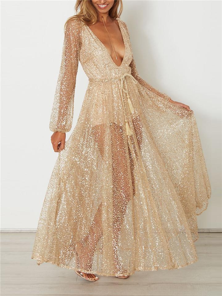 Olhe o seu melhor em qualquer evento formal usando o vestido íngreme de decote em V feminino com material semi-sher e mangas compridas. Possui tecido transparente ao longo das coxas e braços, bem como um pescoço em V nítido.