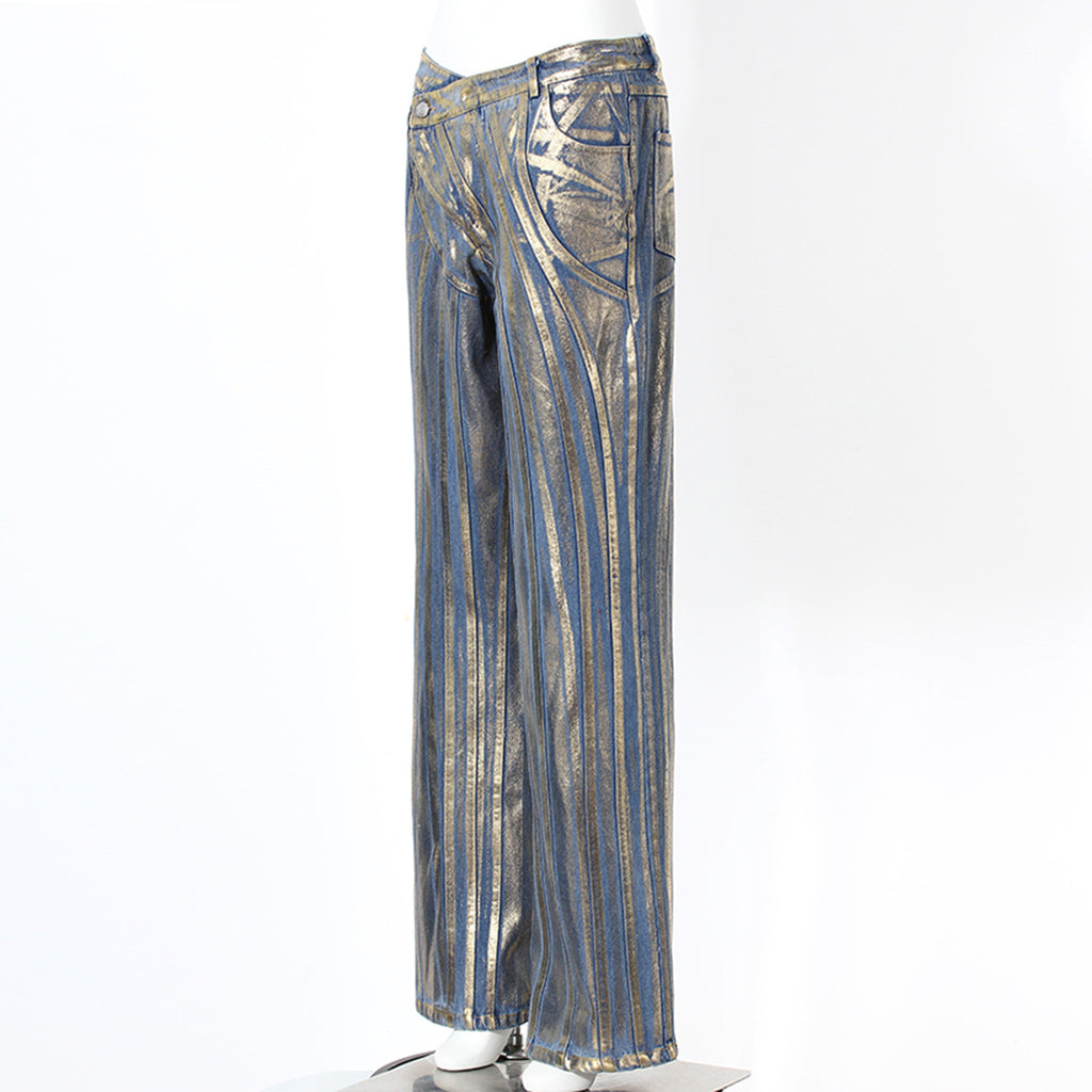 鍍金的斜面牛仔褲和銀色刷細節